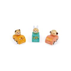 Assortment of 15 pull-back cars:5 pieces of each animal (bear, rabbit, monkey). Simply pull the car back then let it go to have it drive itself like a real racing car. The animals´ ears are made of felt. The hood of each car is printed with a number and a different design related its animal (e....